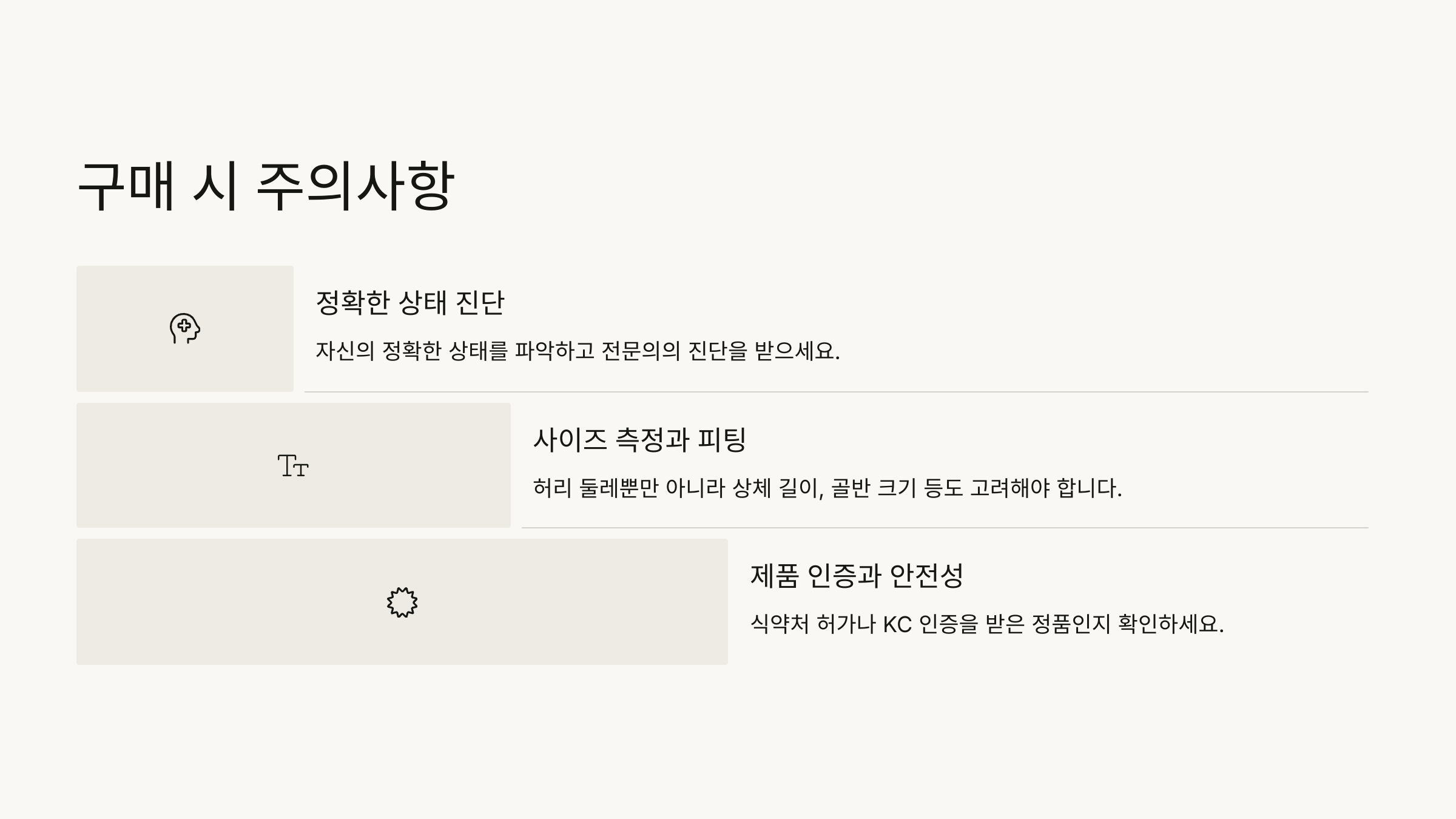 허리보조기나 보호대를 구매할 때는 여러 가지 중요한 사항들을 반드시 확인해야 해요. 가장 먼저 자신의 정확한 상태 진단이 필요해요. 단순한 근육 피로인지, 디스크 문제인지, 아니면 더 심각한 척추 질환인지에 따라 필요한 제품이 완전히 달라지거든요. 특히 허리보조기의 경우 의사의 처방 없이 임의로 구매해서 사용하면 오히려 상태가 악화될 수 있어요. 그래서 반드시 정형외과 전문의의 정확한 진단과 처방을 받은 후 구매해야 해요.