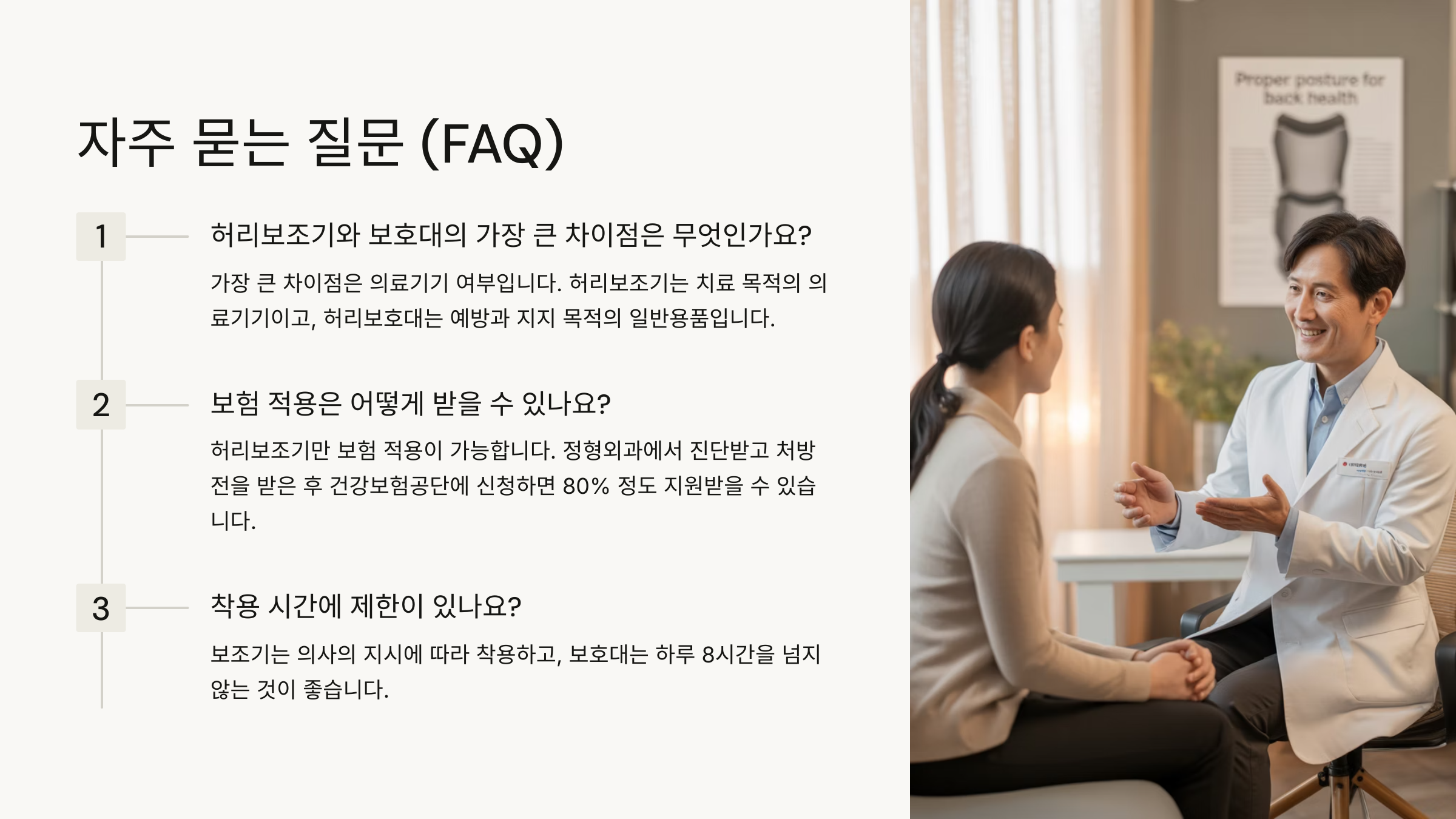 만성 허리통증이나 가벼운 디스크 문제가 있는 경우에는 상황에 따라 선택이 달라져요. 통증이 심하고 일상생활에 지장이 있다면 의료진과 상담하여 보조기 착용을 고려해야 하고, 가벼운 불편감 정도라면 고품질의 허리보호대로도 충분한 도움을 받을 수 있어요. 중요한 것은 자가 진단에 의존하지 말고 전문의의 정확한 진단을 받는 것이에요. 특히 방사통이나 하지 마비 증상이 있다면 즉시 병원을 방문해야 해요.