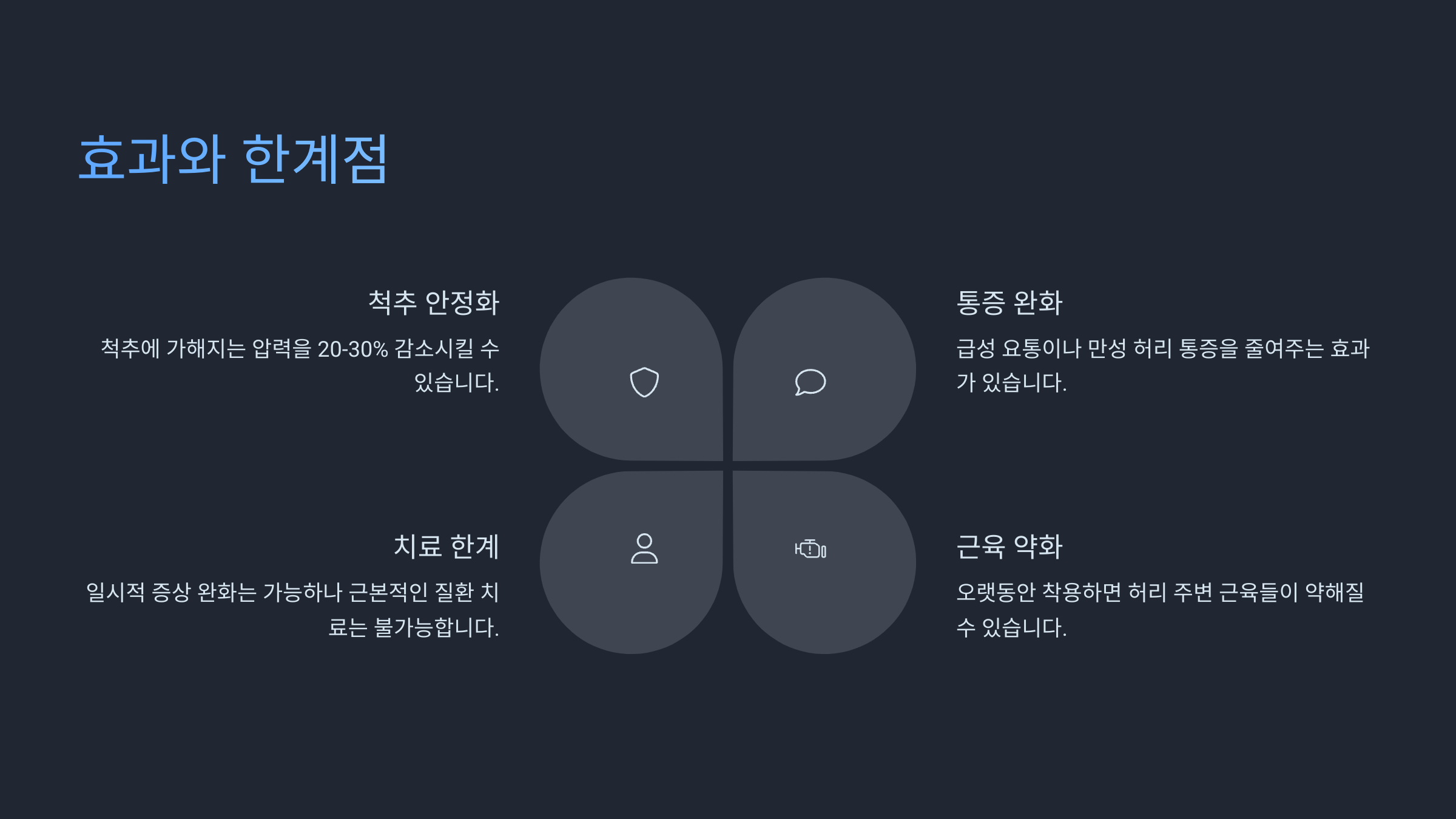 | 근력 | 즉시 지지력 향상 | 장기간 근력 약화 | 운동 병행 필수 |