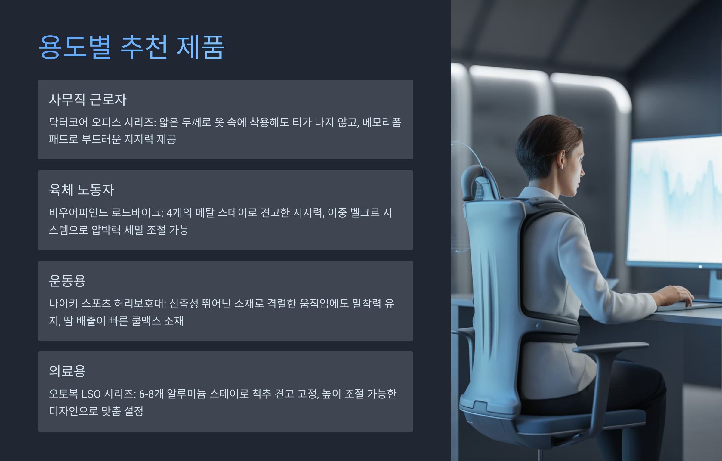 직업과 활동량에 맞는 제품을 선택하면 허리 건강을 효과적으로 보호할 수 있어요. 무조건 비싼 제품보다는 용도에 맞는 제품을 찾는 게 현명해요! 💪