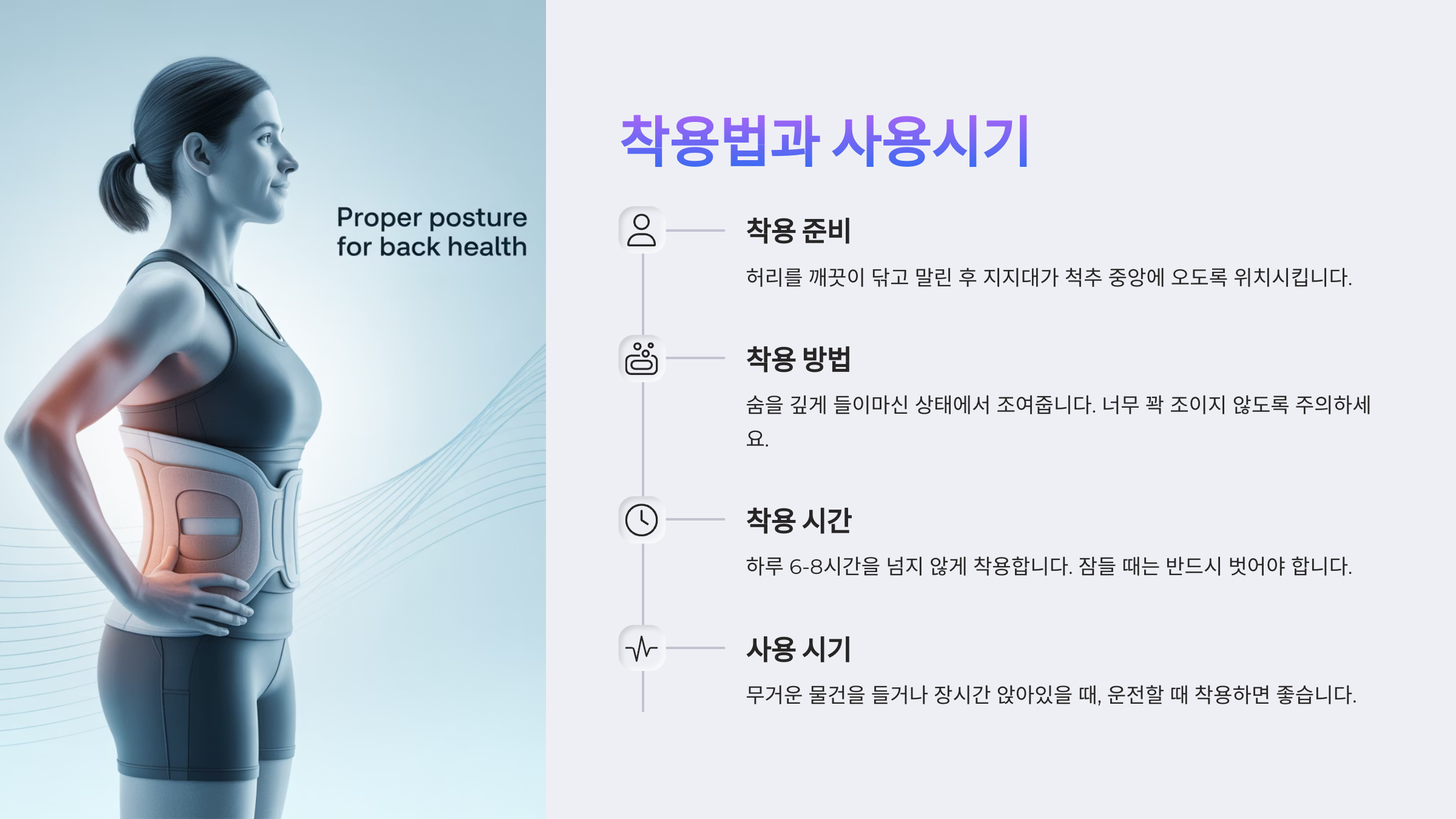 올바른 착용법을 익히면 보호대의 효과를 최대한 누릴 수 있어요. 처음에는 어색하지만 며칠 지나면 자연스럽게 착용할 수 있게 될 거예요! 👔