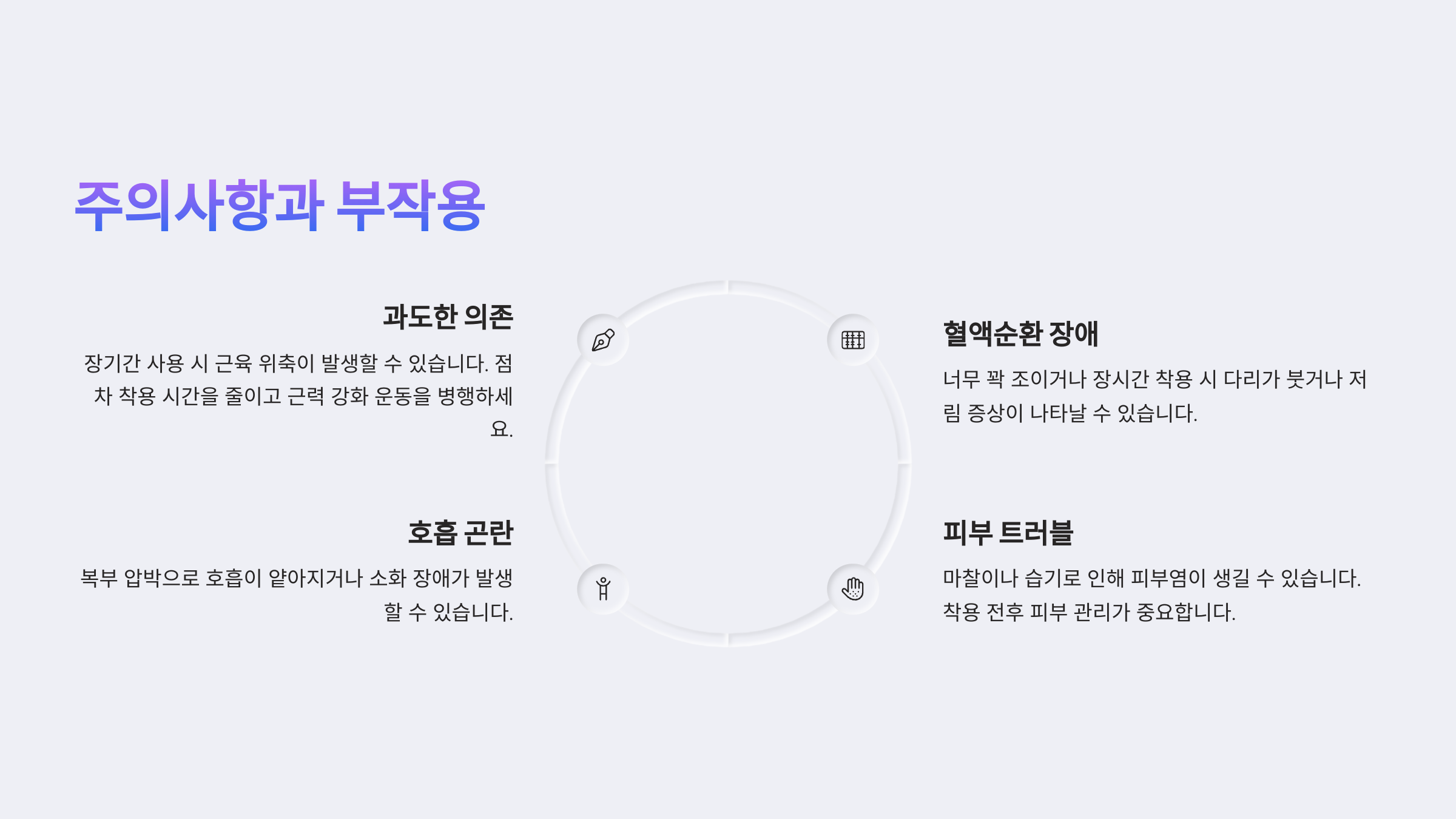 | 당뇨 환자 | 혈액순환 체크 | 3시간 이하 | 밤새 착용 |