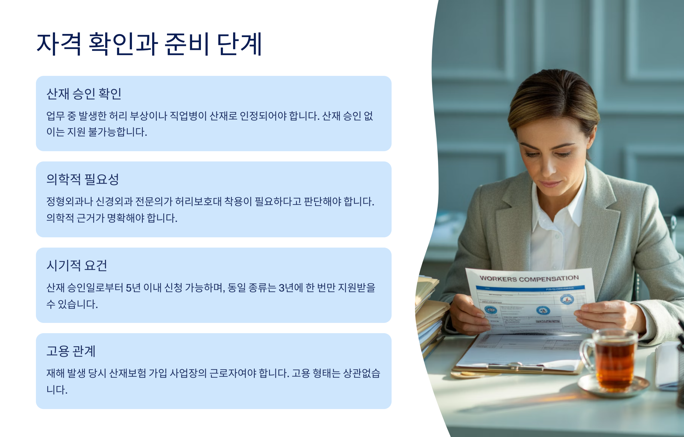 허리보호대 지원을 신청하기 전에 가장 먼저 확인해야 할 건 본인의 자격 요건이에요. 첫 번째 필수 조건은 산업재해 승인을 받았어야 한다는 거예요. 업무 중 발생한 허리 부상이나 직업병으로 인한 허리 질환이 산재로 인정되어야 하는 것이 기본 전제조건이랍니다. 만약 아직 산재 신청을 하지 않았다면 허리보호대 신청보다 산재 신청을 먼저 해야 해요. 산재 승인 없이는 허리보호대 지원을 받을 수 없거든요.
