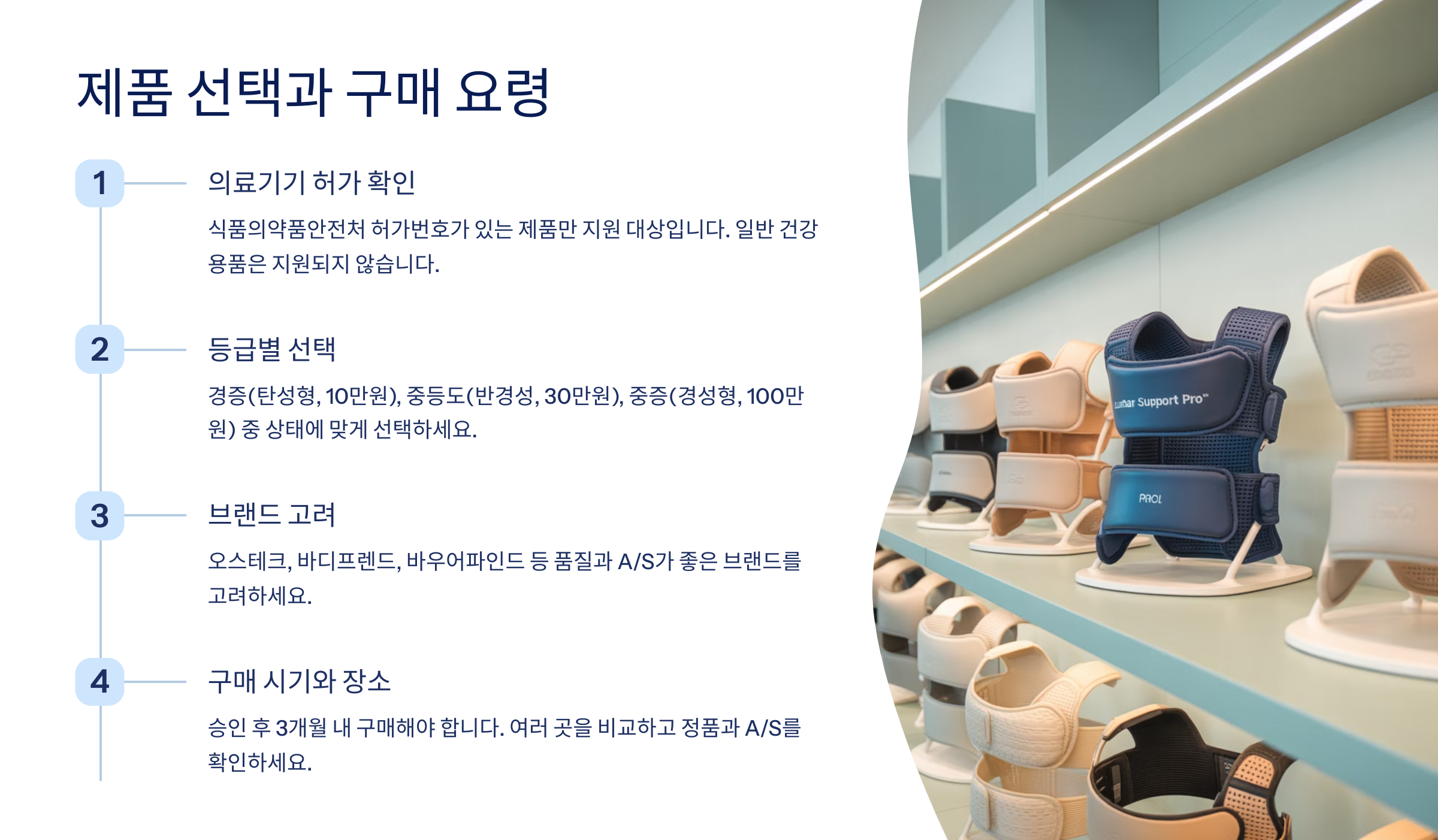구매 시기와 장소도 전략적으로 선택하면 좋아요. 승인 통지를 받은 후 3개월 이내에 구매해야 하는데, 너무 서두르지 말고 여러 곳을 비교해보세요. 같은 제품이라도 판매처에 따라 가격 차이가 날 수 있어요. 의료기기 전문점에서는 전문 상담을 받을 수 있고, 온라인에서는 가격이 저렴할 수 있어요. 중요한 건 정품이고 A/S가 가능한 곳에서 구매하는 거예요.