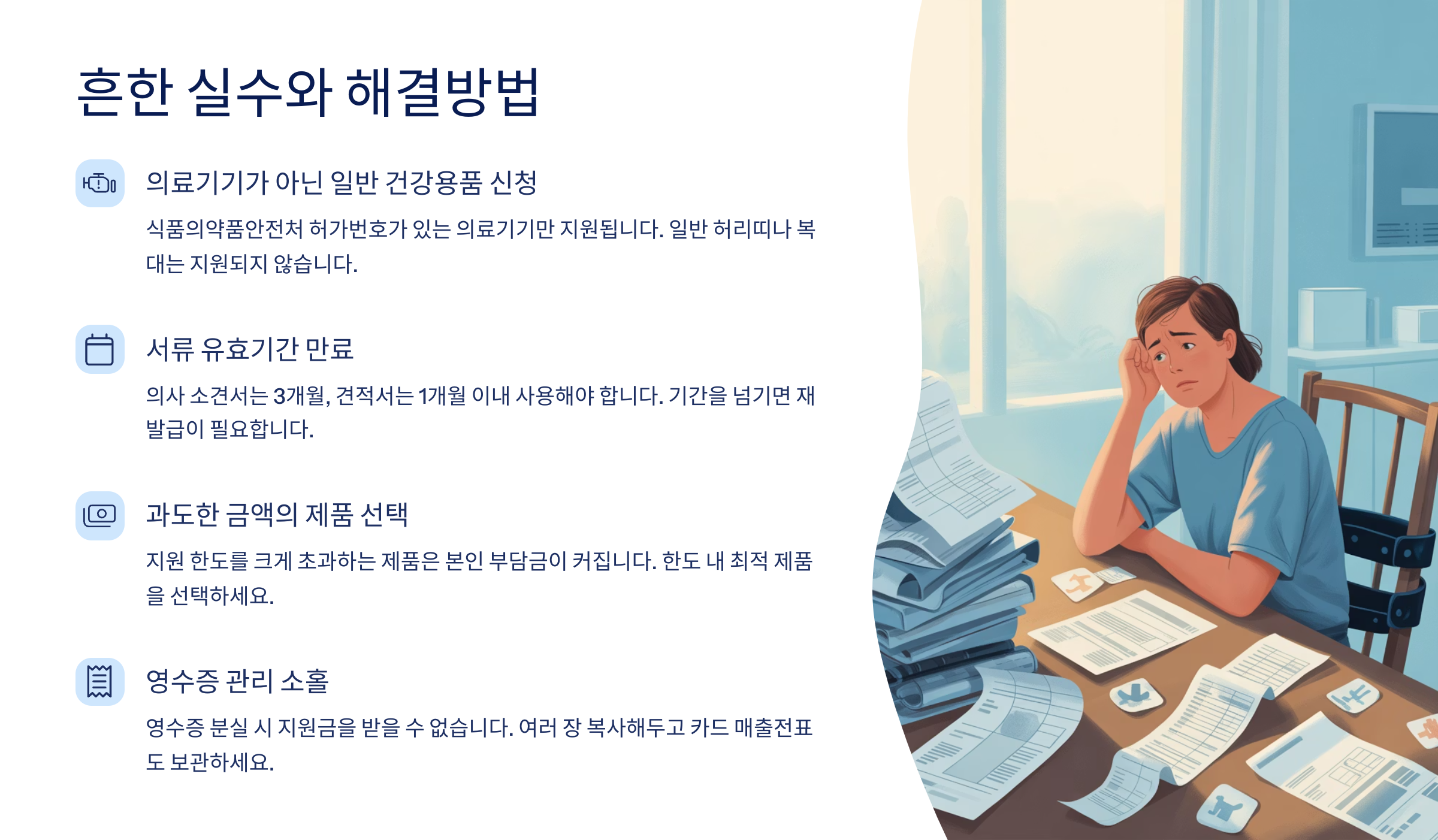 두 번째 실수는 서류 유효기간을 놓치는 거예요. 의사 소견서나 처방전은 발급일로부터 3개월 이내에 사용해야 하는데, 이 기간을 넘기면 새로 발급받아야 해요. 또한 견적서도 1개월 이내에 사용해야 하니까 시기를 잘 맞춰서 준비하세요. 특히 연말연시나 휴가철에는 병원이나 공단 업무가 지연될 수 있으니까 여유를 두고 진행하는 것이 좋아요.