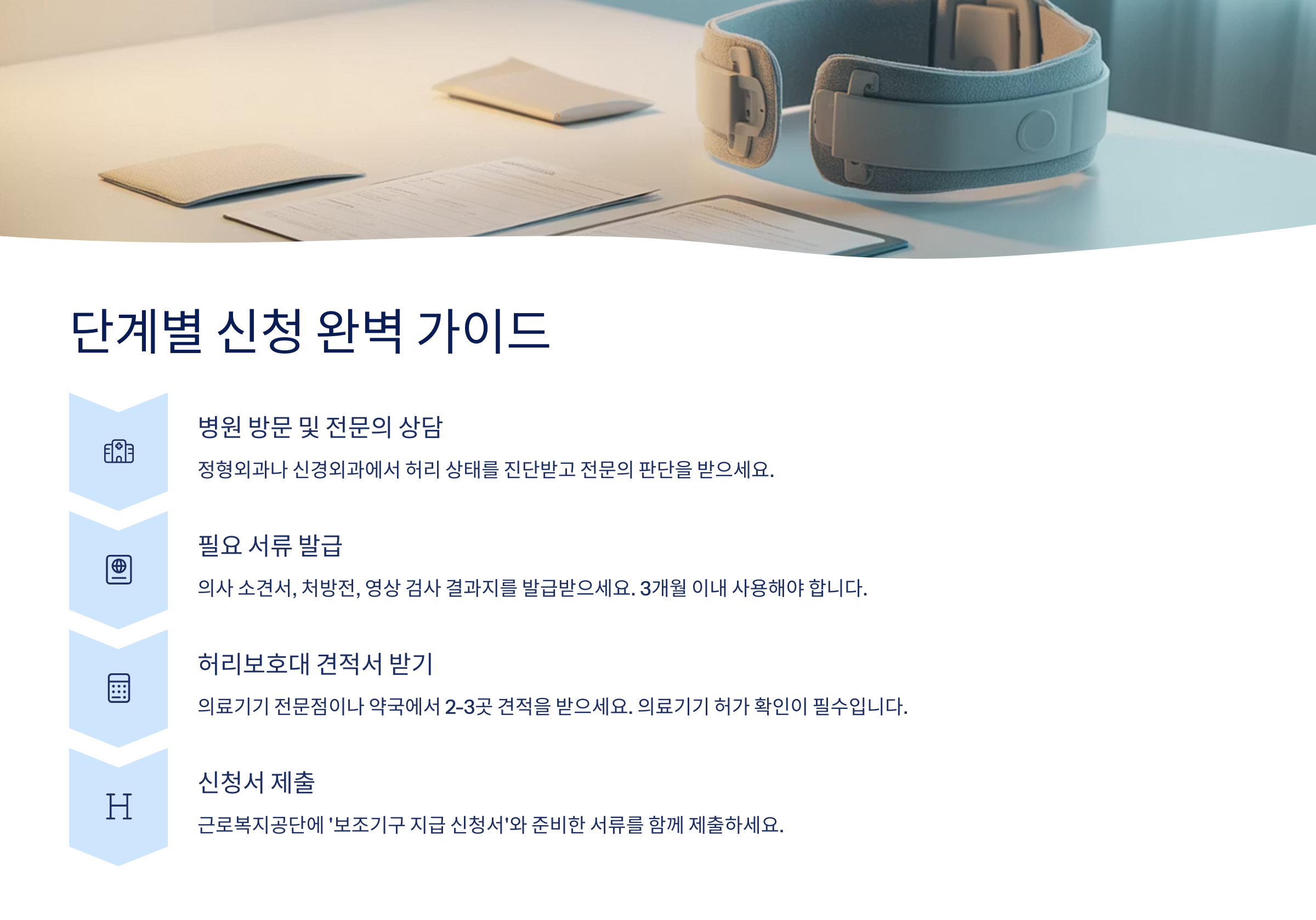 허리보호대 지원 신청은 총 7단계로 나누어져 있어요. 1단계는 병원 방문 및 전문의 상담이에요. 정형외과나 신경외과에서 현재 허리 상태를 정확히 진단받고, 허리보호대가 정말 필요한지 전문의의 판단을 받아야 해요. 이때 산재보험 지원을 받을 예정이라고 미리 말씀드리면 필요한 서류 작성에 도움을 받을 수 있어요. 의사에게 어떤 종류의 허리보호대가 가장 적합한지, 착용 기간은 얼마나 되는지 구체적으로 문의하세요.