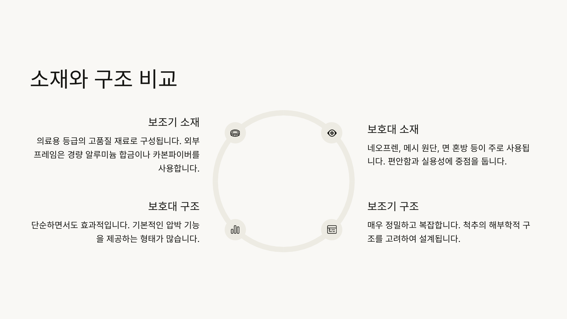 | 척추 고정 | 강력한 고정 | 가벼운 지지 | 보조기 우세 |