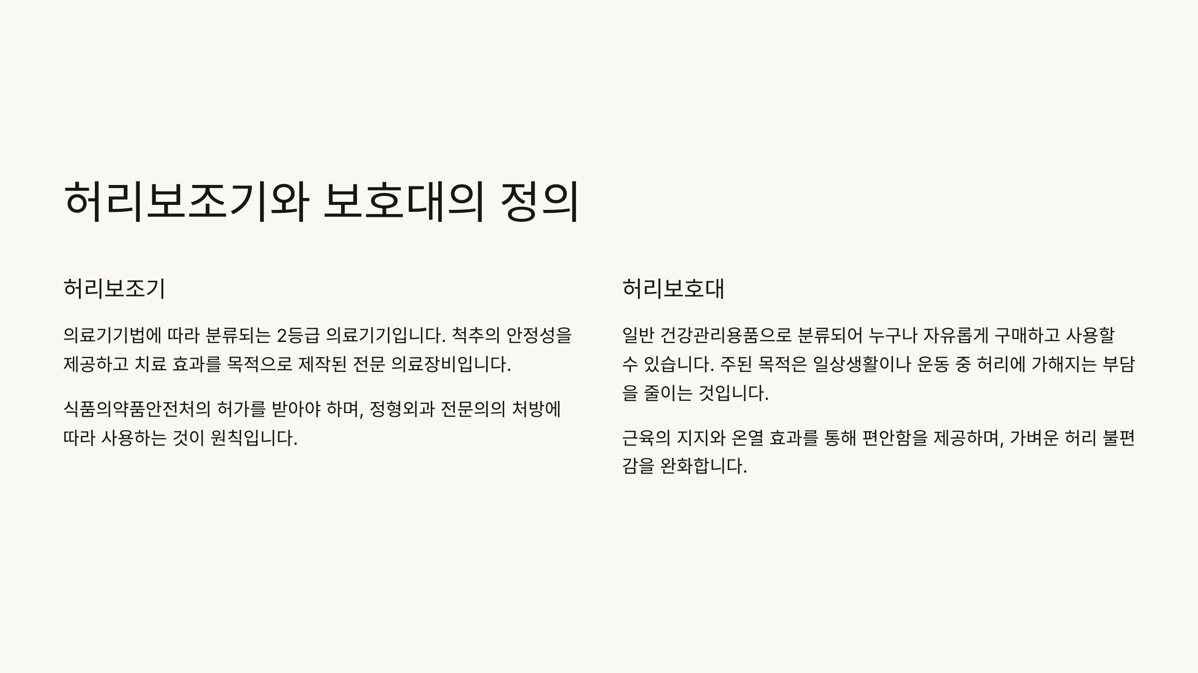 A1. 가장 큰 차이점은 의료기기 여부예요. 허리보조기는 치료 목적의 의료기기이고, 허리보호대는 예방과 지지 목적의 일반용품이에요. 따라서 사용 목적과 효과가 완전히 달라요.